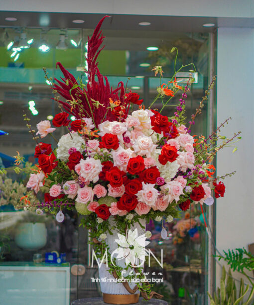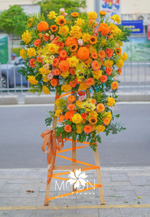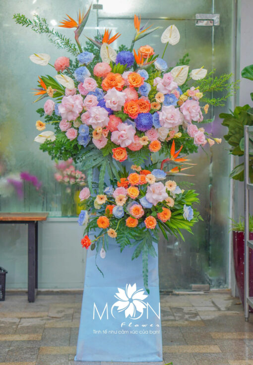 Kệ hoa chúc mừng từ Moon Flower không chỉ là món quà mà còn là dấu ấn, là lời nhắn gửi tinh tế đến những khoảnh khắc đáng nhớ trong cuộc đời mỗi người. Dù là khai trương hay những khởi đầu rực rỡ, hay thăng chức vươn tới tầm cao mới, hay đơn giản là một lời động viên đầy yêu thương, Moon Flower luôn sẵn sàng đồng hành cùng bạn để trao đi điều đẹp đẽ nhất. Từng cánh hoa được tuyển chọn kỹ lưỡng, phối kết một cách nghệ thuật và mang đậm tính cá nhân hóa. Những màu sắc rực rỡ thường tượng trưng cho sự giàu có, thịnh vượng và sự may mắn trong kinh doanh. Đây là một trong những sự lựa chọn hoàn hảo trong các buổi lễ và sự kiện quan trọng.