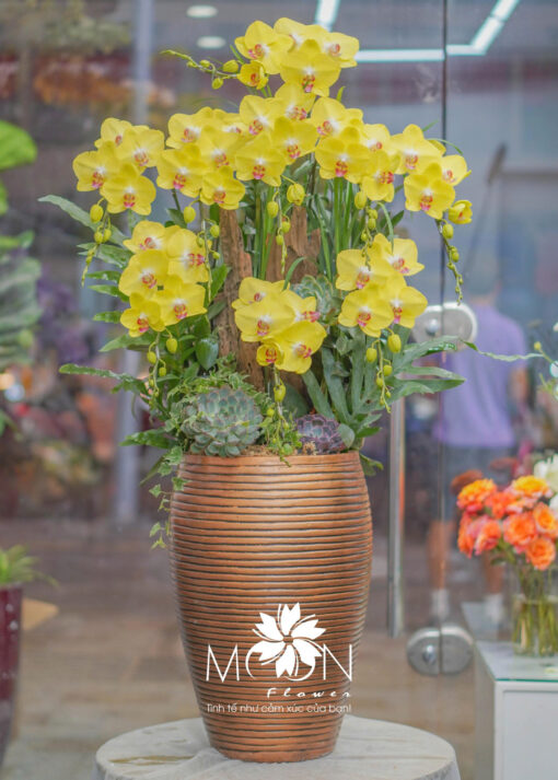 Chậu lan hồ điệp đại ghép gỗ lũa 9 cành vàng sang trọng, phú quý. Thiết kế hoành tráng, bố cục hài hòa giữa sắc hoa cùng phụ kiện sen đá mang đến vẻ đẹp sang trọng, tinh tế mhà vẫn gần gũi với thiên nhiên. Một tác phẩm lan hồ điệp hoàn hảo để chúc mừng, khai trương hoặc làm điểm nhấn cho không gian đẳng cấp. Phù hợp để bàn, trang trí không gian.