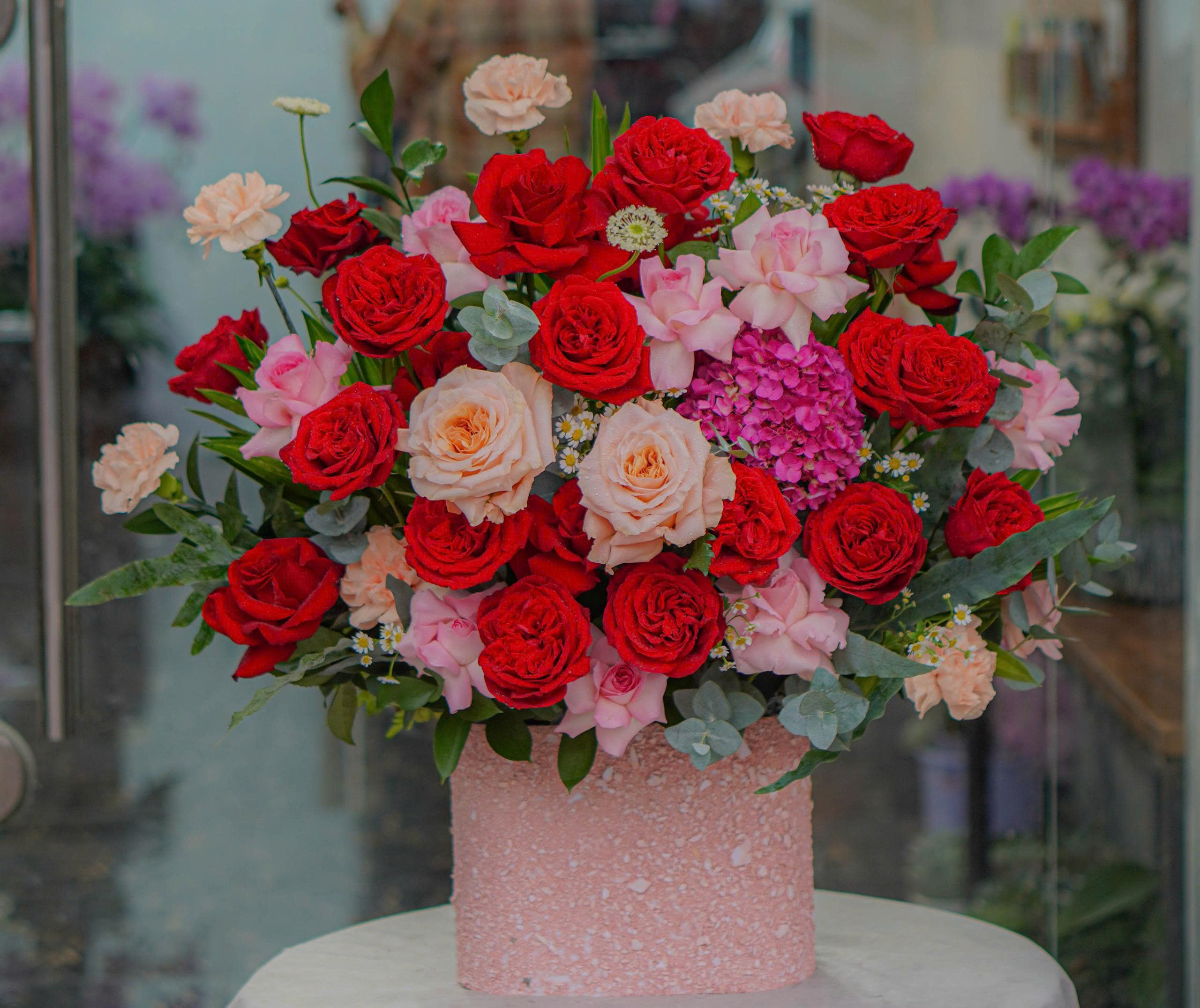 Bình hoa tone đỏ chủ đạo được kết hợp hài hòa cùng nhiều loài hoa kiêu hãnh, tạo nên một bản phối rực rỡ và tràn đầy năng lượng. Sắc vàng ấm áp lan tỏa cảm giác tươi mới, tượng trưng cho niềm vui, sự lạc quan và khởi đầu tích cực, trong khi mỗi loài hoa góp mặt như một điểm nhấn riêng của sức sống, đam mê và khát khao vươn lên.