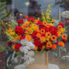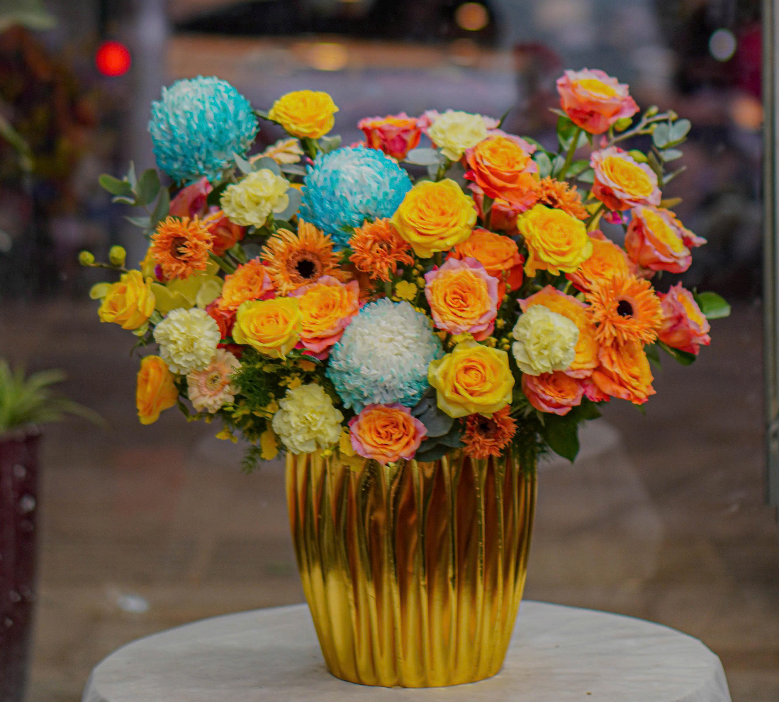 Bình hoa tone cam chủ đạo được kết hợp hài hòa cùng nhiều loài hoa kiêu hãnh, tạo nên một bản phối rực rỡ và tràn đầy năng lượng. Sắc vàng ấm áp lan tỏa cảm giác tươi mới, tượng trưng cho niềm vui, sự lạc quan và khởi đầu tích cực, trong khi mỗi loài hoa góp mặt như một điểm nhấn riêng của sức sống, đam mê và khát khao vươn lên.