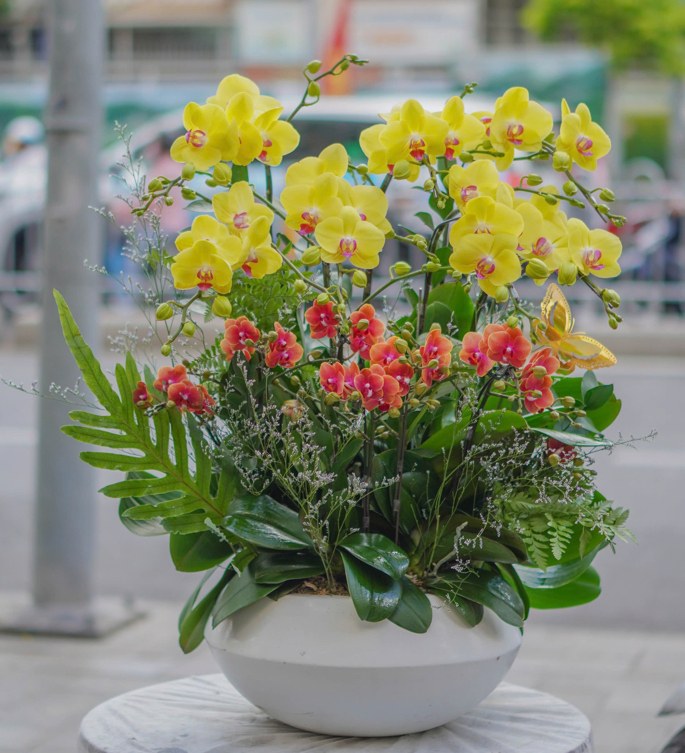 Chậu lan hồ điệp rực rỡ với 7 cành đại vàng sáng rạng ngời phối cùng 6 cành lan mini cam đầy năng lượng, tạo nên tổng thể hài hòa và nổi bật. Sự kết hợp giữa sắc vàng tượng trưng cho tài lộc và sắc cam mang ý nghĩa nhiệt huyết, may mắn khiến thiết kế thêm phần sinh động và tươi mới. Đây là lựa chọn lý tưởng cho các dịp mừng khai trương, thành công hay làm điểm nhấn sang trọng cho không gian sống và làm việc.