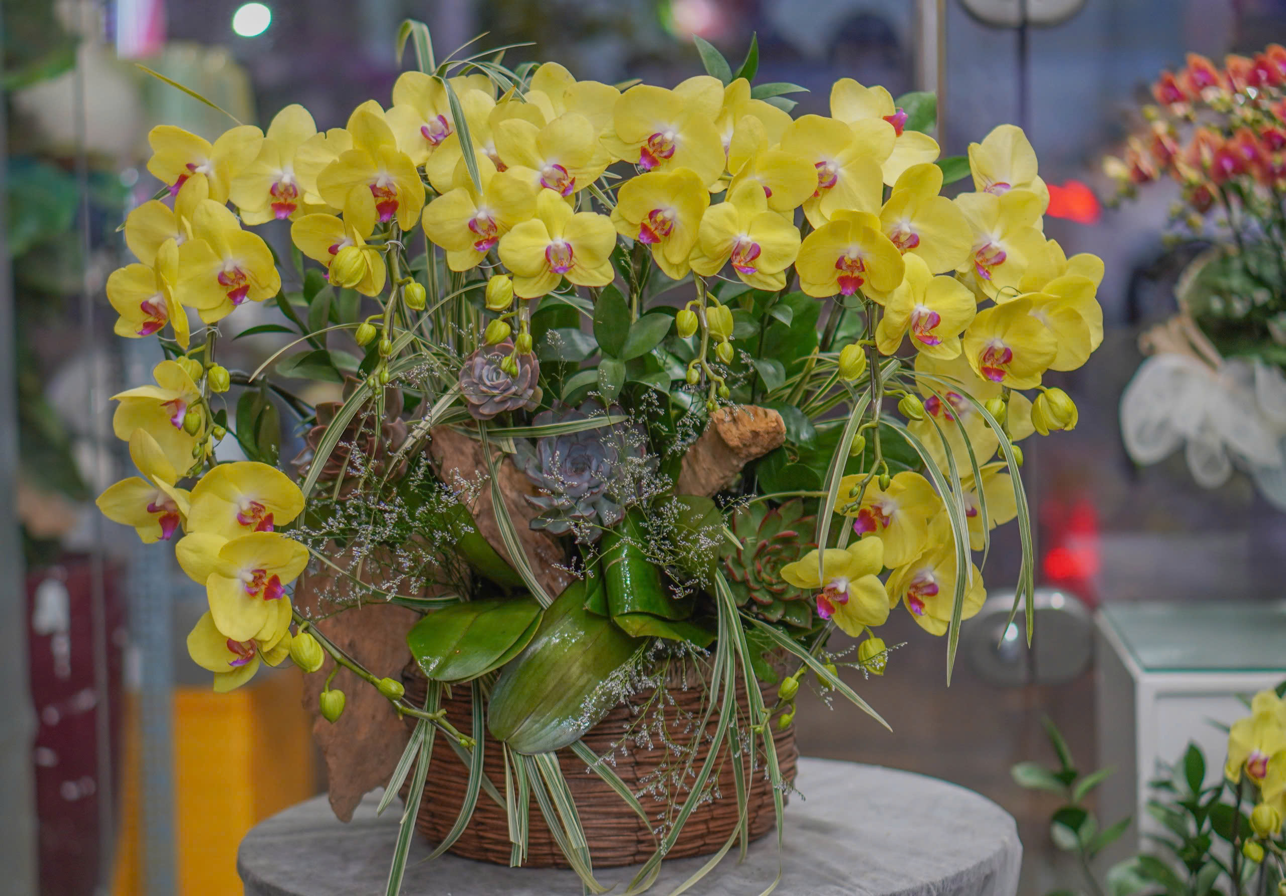 Giỏ lan hồ điệp gồm 8 cành lan đại vàng rực rỡ, được sắp xếp khéo léo trong giỏ mây mang đến tổng thể vừa sang trọng vừa gần gũi. Sắc vàng tươi sáng là biểu tượng của tài lộc, thành công và niềm vui, rất thích hợp cho các dịp chúc mừng, khai trương hay tân gia. Thiết kế nổi bật, giàu ý nghĩa và đầy sức sống – một món quà tinh tế để gửi gắm lời chúc tốt đẹp.