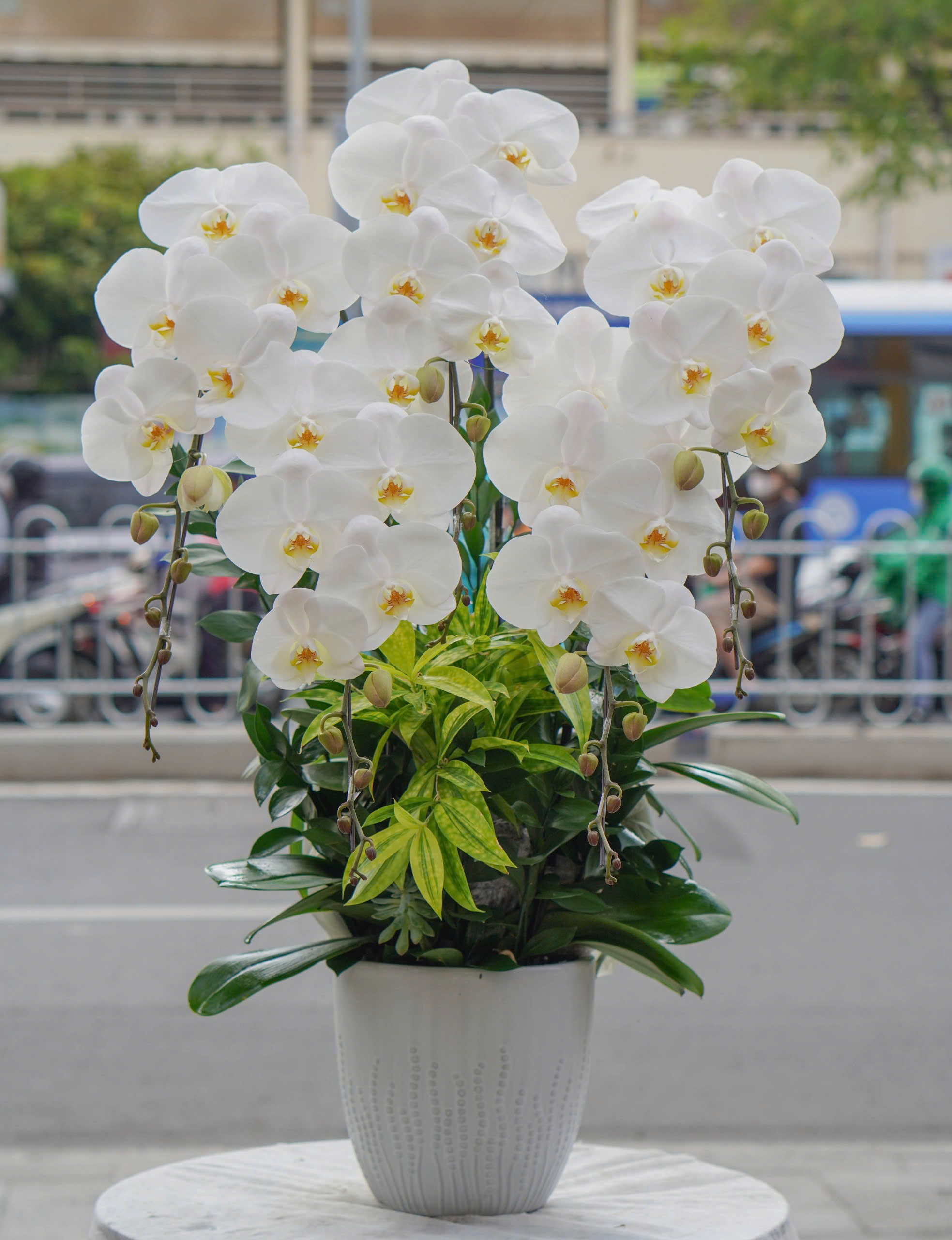 Chậu lan hồ điệp trắng gồm 10 cành đại được sắp xếp cân đối và thanh thoát, toát lên vẻ đẹp thuần khiết, sang trọng và đẳng cấp. Sắc trắng tinh khôi biểu trưng cho sự khởi đầu mới, may mắn và sự tinh tế trong từng chi tiết. Thiết kế ấn tượng này phù hợp để trang trí không gian trang trọng hoặc làm quà tặng ý nghĩa cho các dịp như khai trương, tân gia, mừng thành công.
