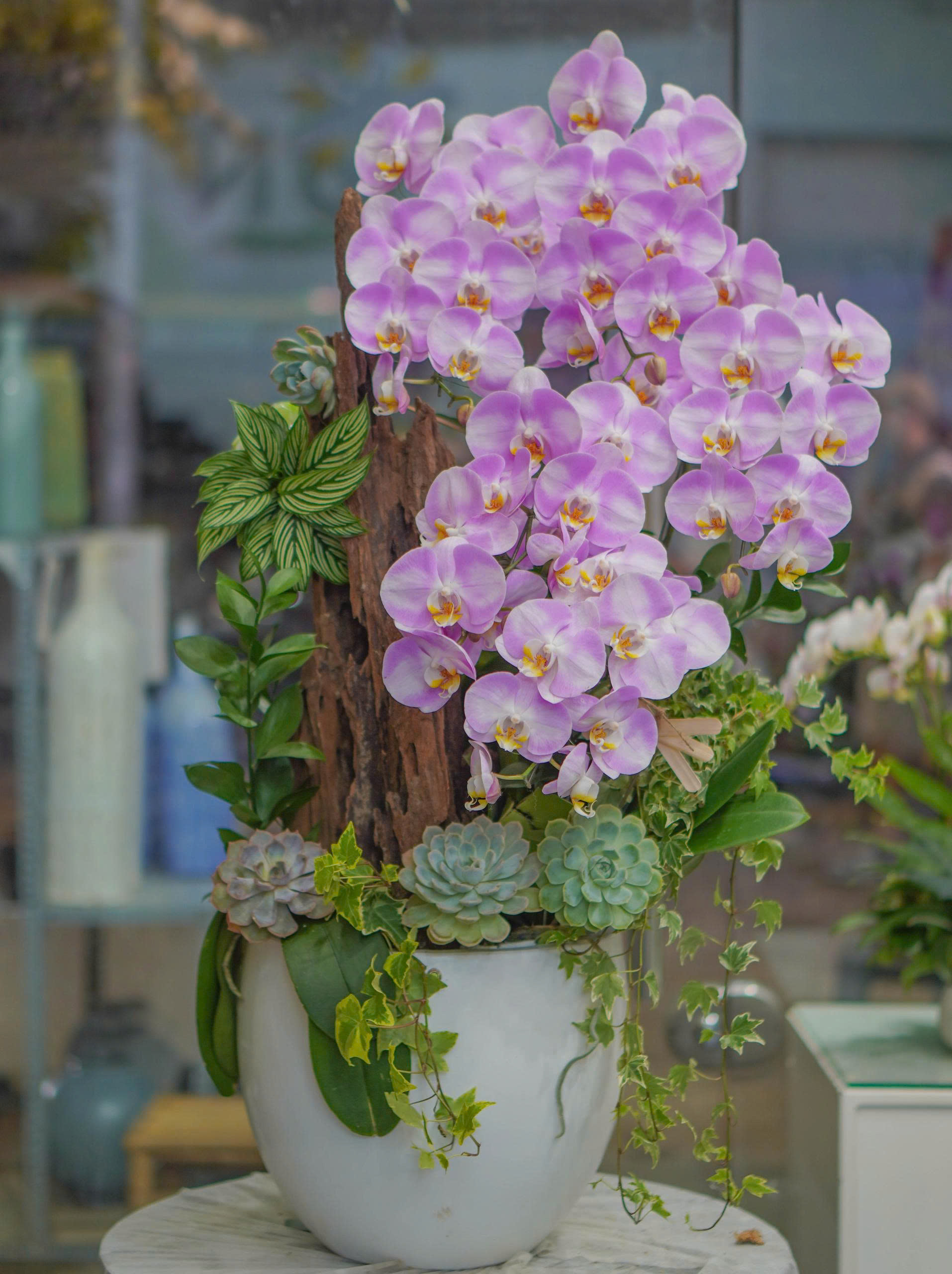Chậu lan hồ điệp tím. Thiết kế hoành tráng, bố cục hài hòa giữa sắc hoa cùng phụ kiên sen đá mang đến vẻ đẹp sang trọng, hiện đại mà vẫn gần gũi với thiên nhiên. Một tác phẩm hoàn hảo để chúc mừng, khai trương hoặc làm điểm nhấn cho không gian đẳng cấp.