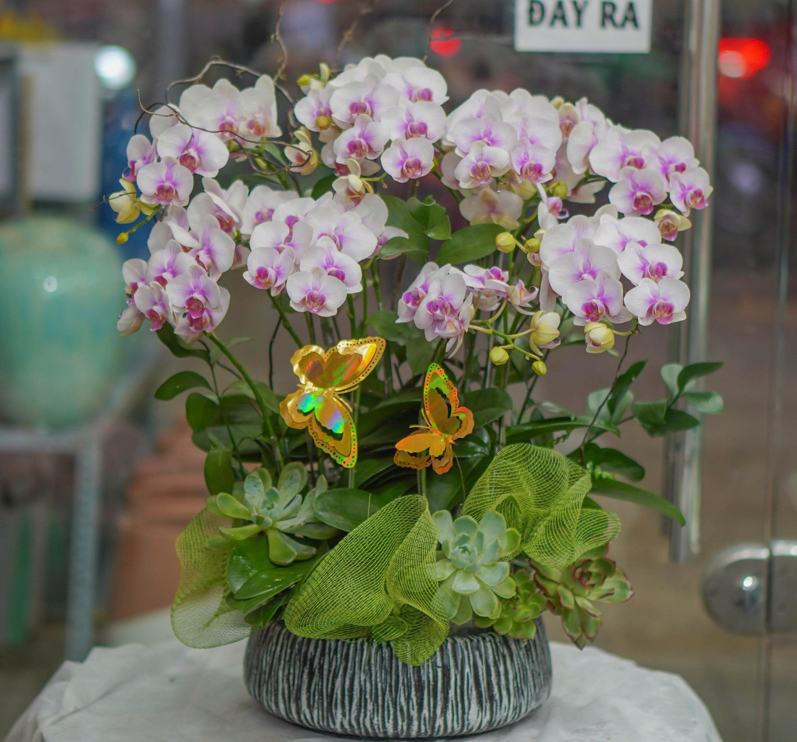 Chậu lan hồ điệp trắng. Thiết kế hoành tráng, bố cục hài hòa giữa sắc hoa cùng phụ kiên sen đá mang đến vẻ đẹp sang trọng, hiện đại mà vẫn gần gũi với thiên nhiên. Một tác phẩm hoàn hảo để chúc mừng, khai trương hoặc làm điểm nhấn cho không gian đẳng cấp.