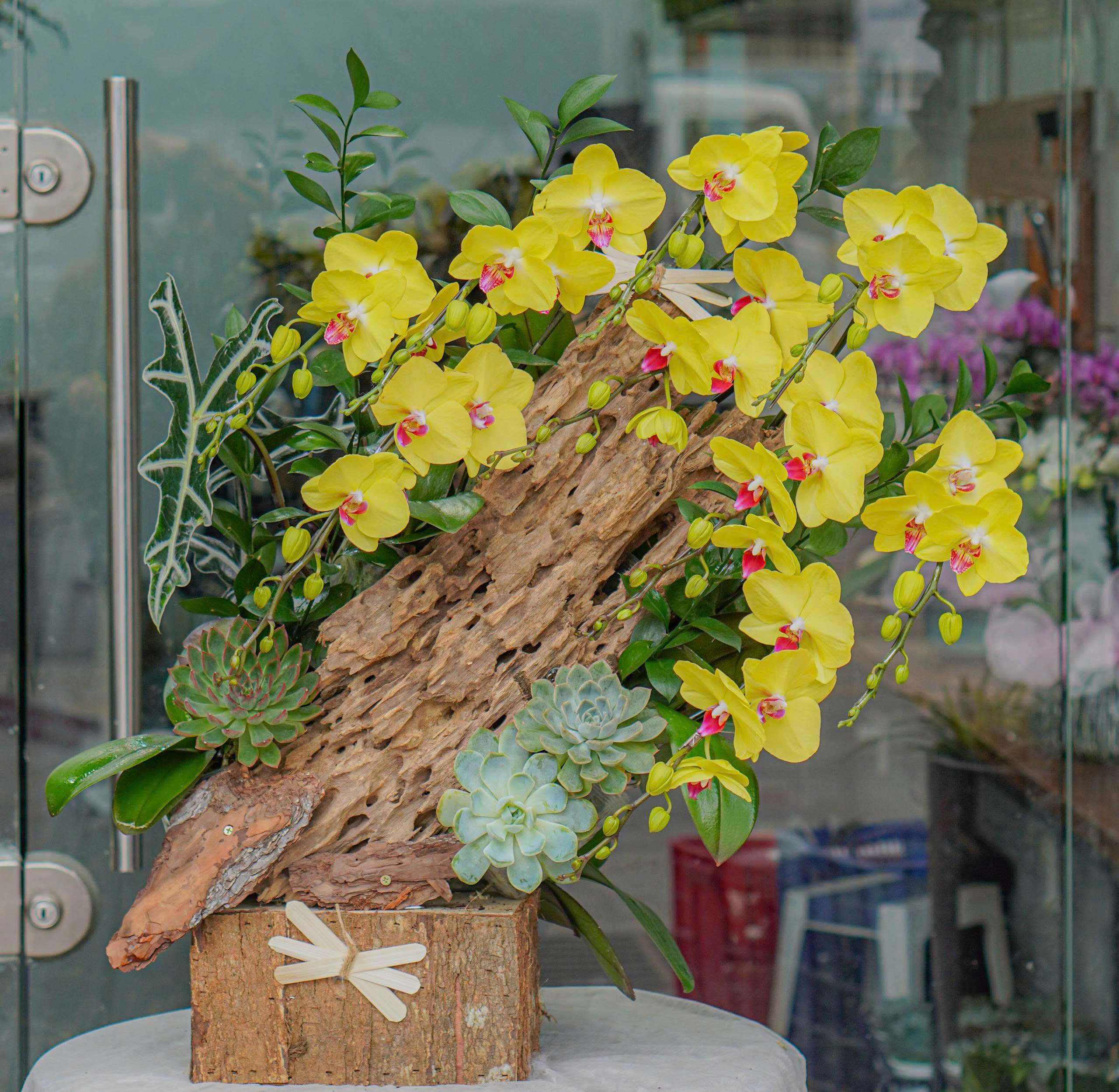 Chậu lan hồ điệp đại ghép gỗ lũa. Thiết kế hoành tráng, bố cục hài hòa giữa sắc hoa cùng phụ kiện sen đá mang đến vẻ đẹp sang trọng, tinh tế mhà vẫn gần gũi với thiên nhiên. Một tác phẩm lan hồ điệp hoàn hảo để chúc mừng, khai trương hoặc làm điểm nhấn cho không gian đẳng cấp. Phù hợp để bàn, trang trí không gian.
