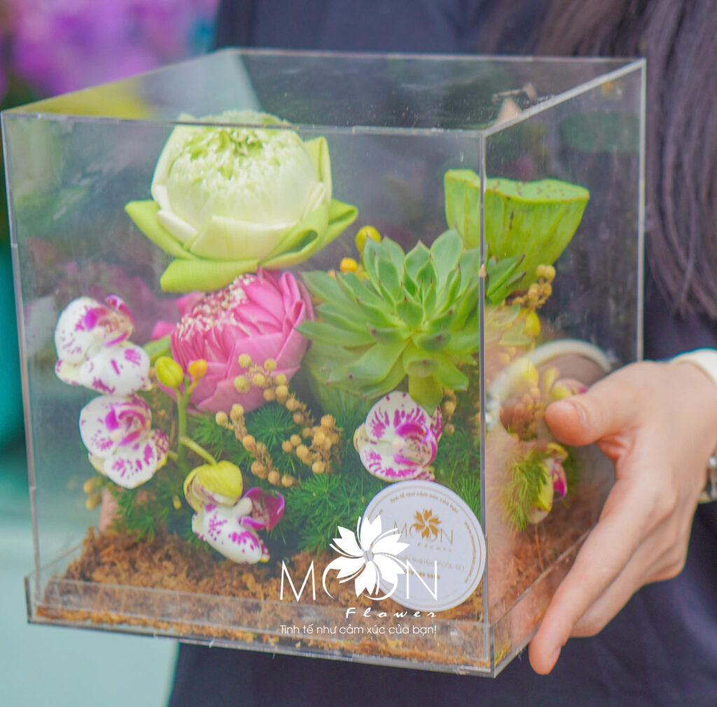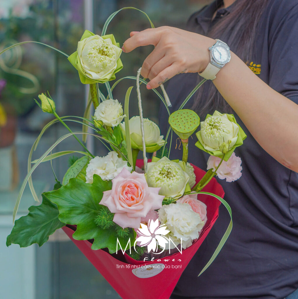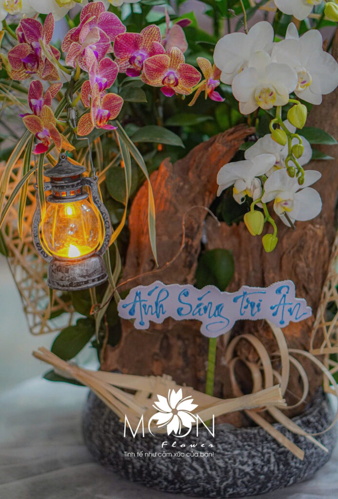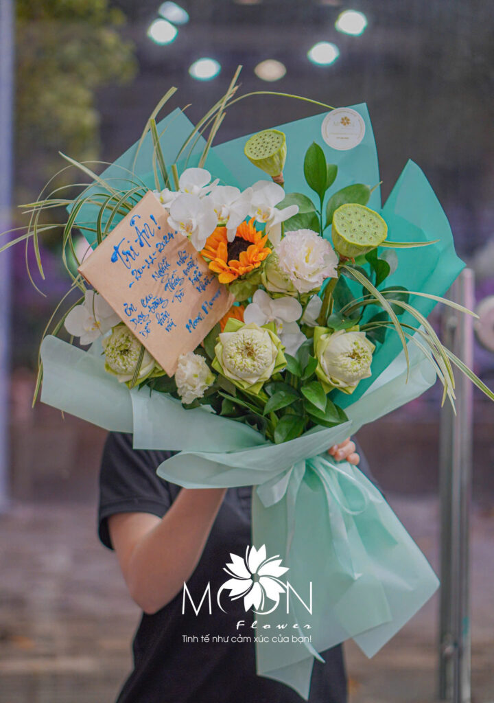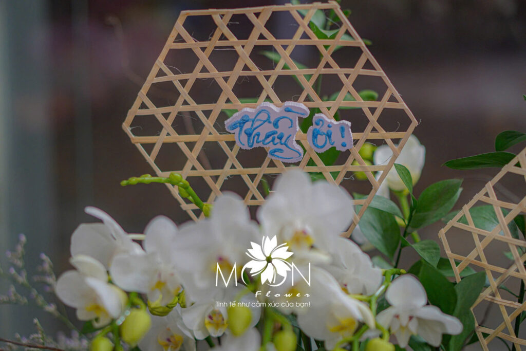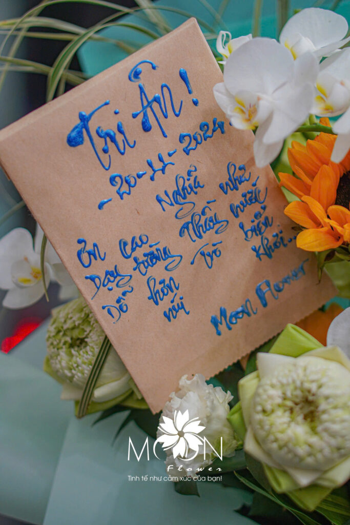 Trong các sản phẩm dành riêng cho Ngày Nhà giáo Việt Nam, Moon Flower đặc biệt chú trọng vào từng chi tiết: từ cách chọn loại hoa, phối màu sắc, đến từng nét chữ thư pháp hay dòng thư viết tay. Những đóa hoa lan, hoa hồng, hoa sen đều được chọn lọc kỹ lưỡng, không chỉ vì vẻ đẹp mà còn vì ý nghĩa mà chúng đại diện. Hoa lan trắng biểu trưng cho sự thanh cao, trong sáng; hoa hồng đỏ là biểu tượng cho lòng biết ơn và tình cảm sâu đậm; hoa sen lại mang ý nghĩa thanh khiết, đầy tôn kính và lòng tri ân.